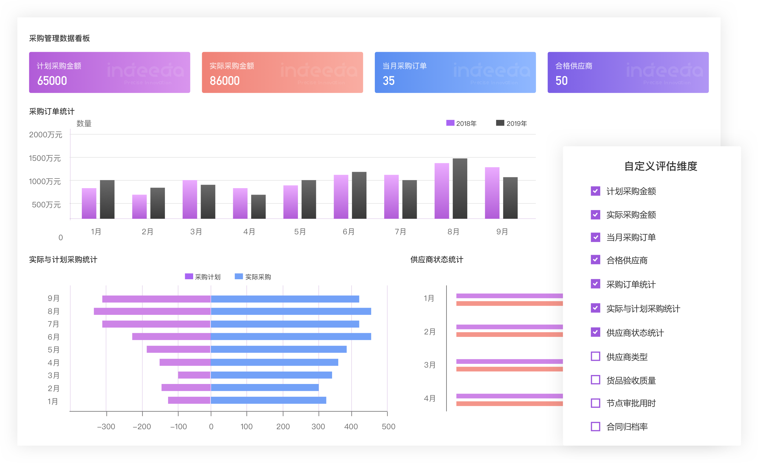 对于预算额度、订单执行情况、采购单价对比、库存消耗情况、供应商在库情况等核心数据进行定量分析与可视化展示,支持自定义评估维度,一键知晓采购运转效能。